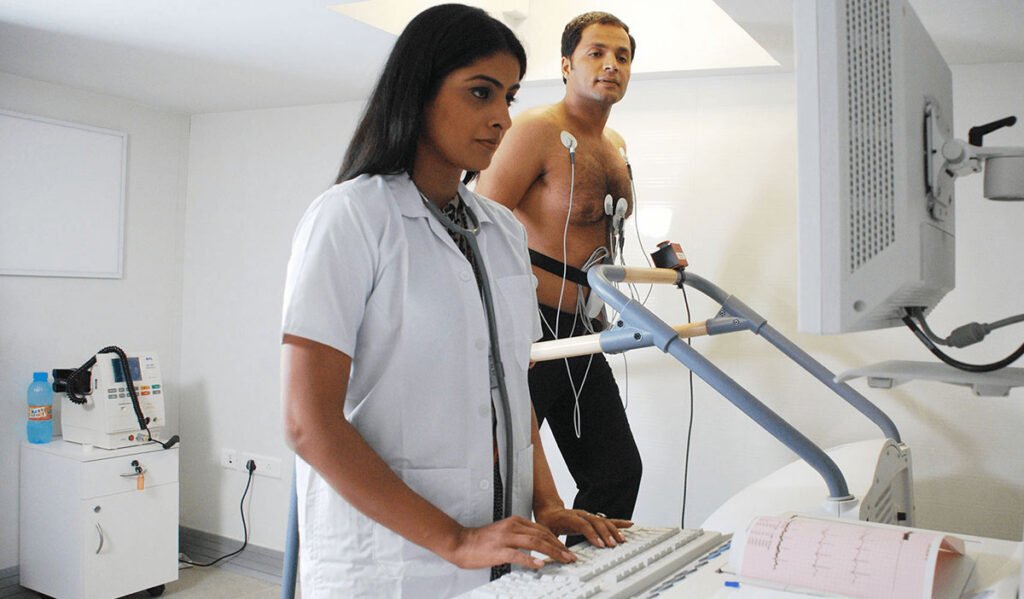 The test is performed on a treadmill. Electrodes will be attached to your chest to monitor heart activity through an ECG machine. You will start walking at a slow pace, and the treadmill’s speed and incline will gradually increase. This simulates exercise and shows how well your heart performs under stress. The procedure is safe, closely monitored, and usually completed within 30–45 minutes.